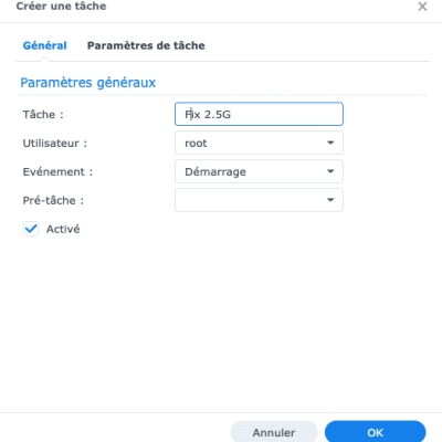 Sur DSM 7.x, le pilote peut sauter après un reboot. On utilise le Planificateur de tâches pour automatiser la "réparation" :
